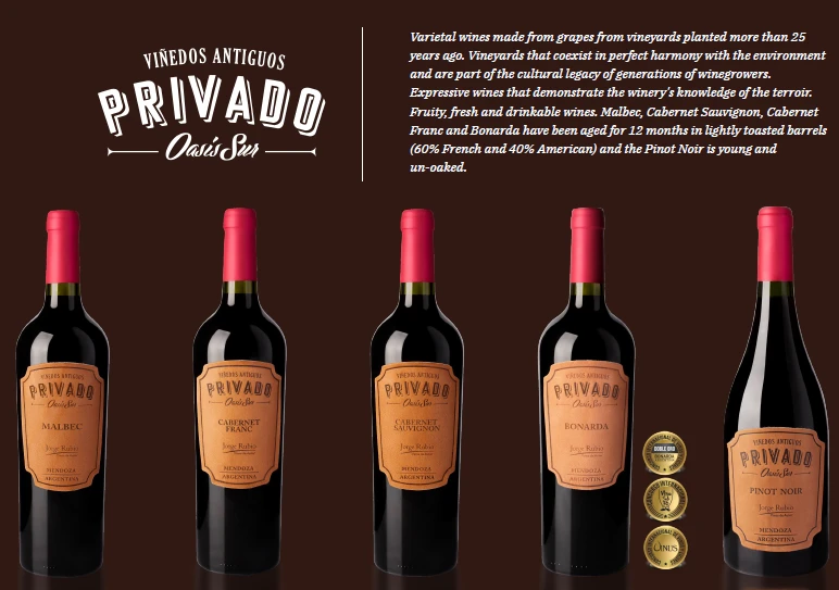 Vinos afrutados, frescos y bebibles. Malbec, Cabernet Sauvignon, Cabernet Franc y Bonarda han sido envejecidos durante 12 meses en barricas ligeramente tostadas (60% francesas y 40% americanas) y el Pinot Noir es joven y joven y sin tostar.